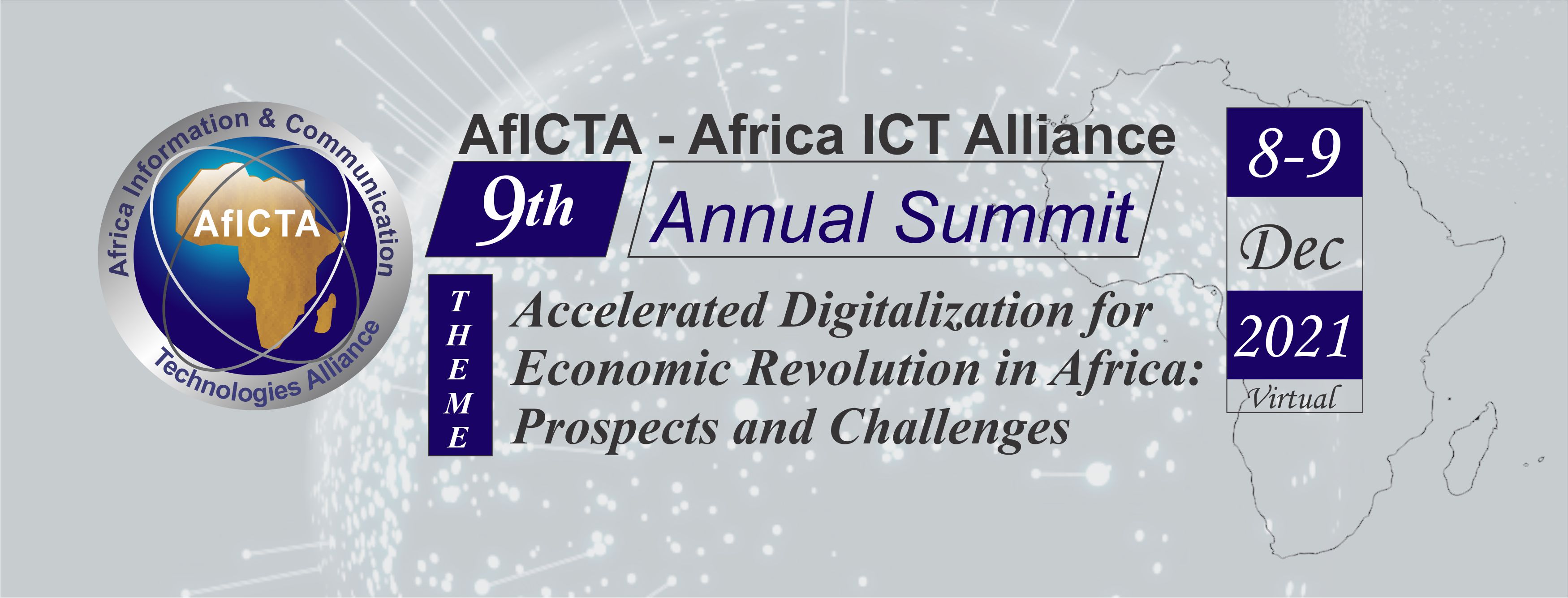 The 9th AfICTA Summit holds virtually from 8-9 December 2021 and the theme being considered is "Accelerated Digitalization for Economic Revolution in Africa: Prospects and Challenges".
