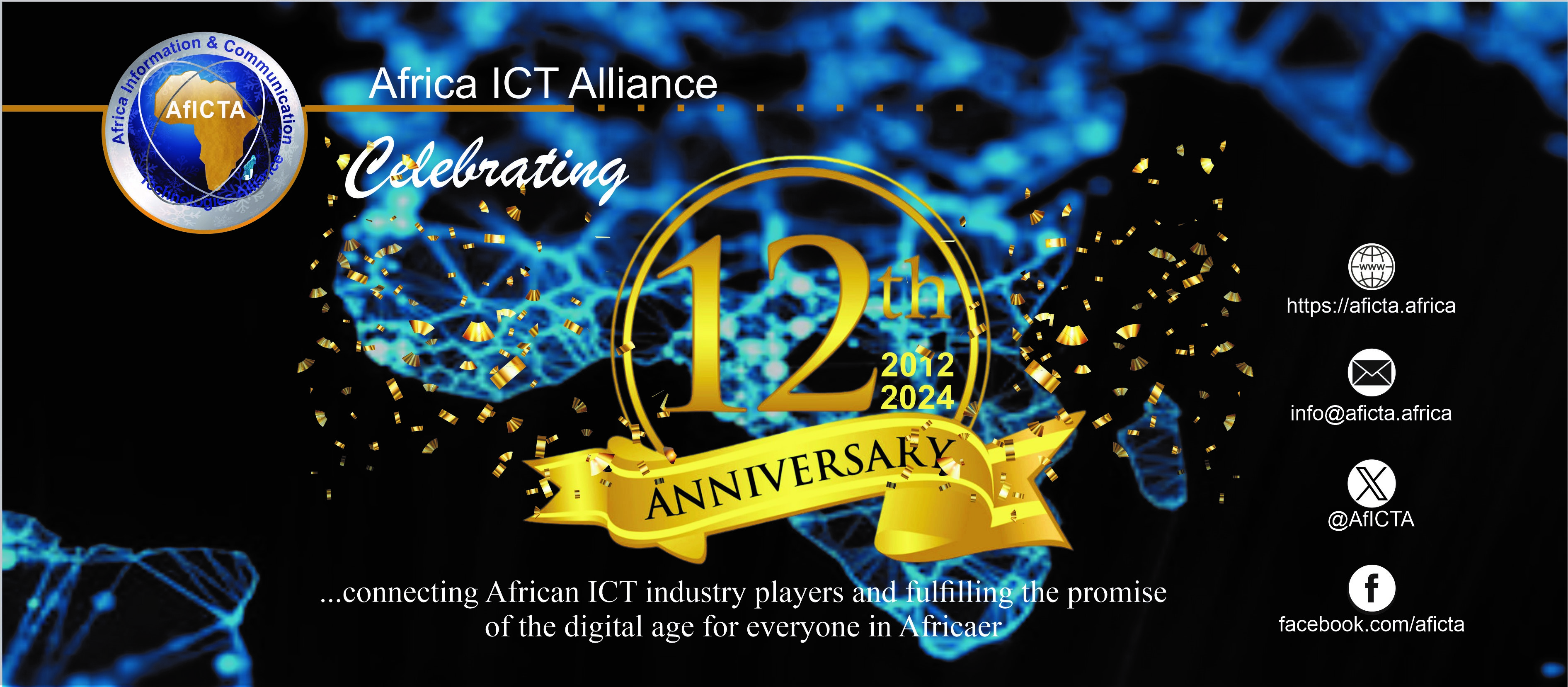 We are excited to celebrate the 12th Anniversary of the Africa ICT Alliance - AfICTA today May 1st, 2024. Over the past twelve years, AfICTA has remained steadfast in its commitment to advancing the digital agenda across Africa, empowering individuals, businesses, and communities through its vision.