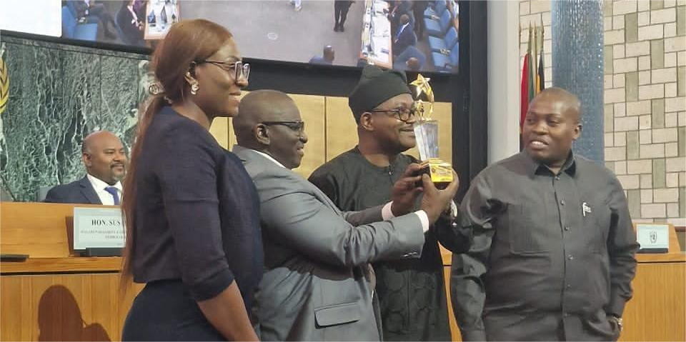 The Advisory Council Chair & Founder, AfICTA - Africa ICT Alliance, Dr. Jimson Olufuye alongside Ms. Christel Youbi, AfICTA Vice-Chair, Central Africa, and Mr. Kileo Yusuph, fmr. AfICTA Board Member, while presenting the Africa ICT Champion award to Dr. Mactar Seck, the Chief of Technology and Innovation Section / Coordinator of Digital Centre of Excellence at United Nations Economic Commission for Africa - UNECA, at the Opening Ceremony Session during the ongoing 13th Africa IGF Session in Addis Ababa, Ethiopia.